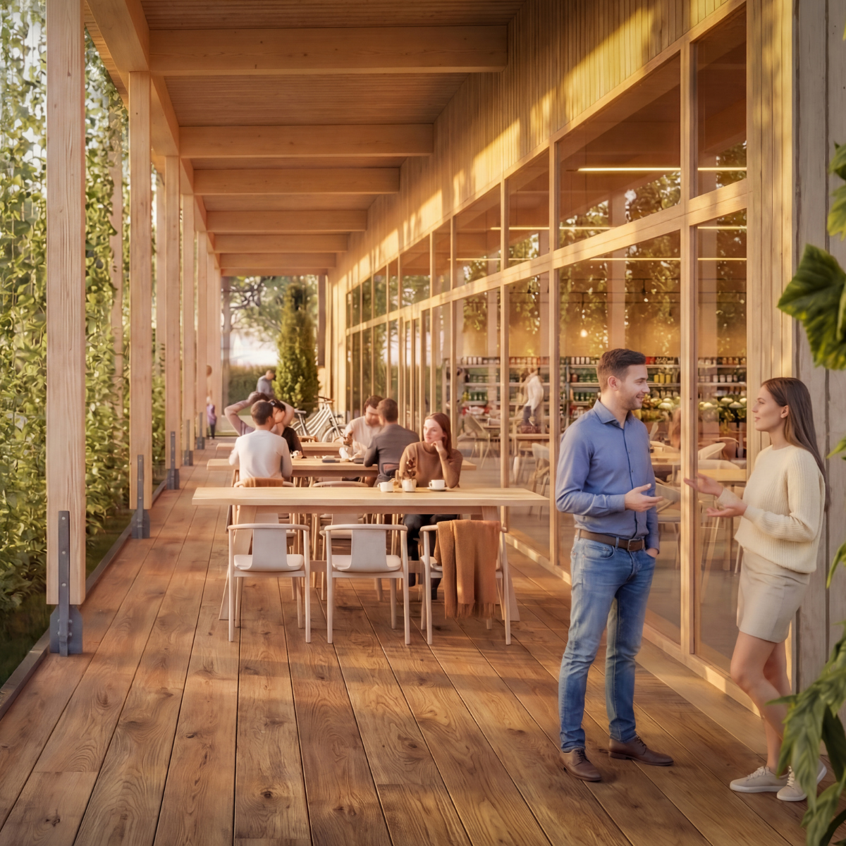 Ein Ort, der Demokratie und Zusammenhalt stärkt, Identität stiftet, Inklusion fördert. Der nicht nur die Wertschätzung für Lebensmittel widerspiegelt, sondern auch für das Leben an sich. Der eine Baukultur prägt und verbreitet, die sich an den planetaren Grenzen und am Wohle der Menschen ausrichtet. Ein Ort, an dem wir voneinander lernen können. Der den Menschen den Wert des Handwerks näherbringt. Der es allen ermöglicht, sich für regionale und nachhaltig produzierte Lebensmittel zu entscheiden. Der sich positiv auf die Umwelt auswirkt, statt ihr zu schaden und der durch das Cradle to Cradle Prinzip auch noch deutlich kosteneffizienter ist. Sowohl im Bau, als auch im laufenden Betrieb.